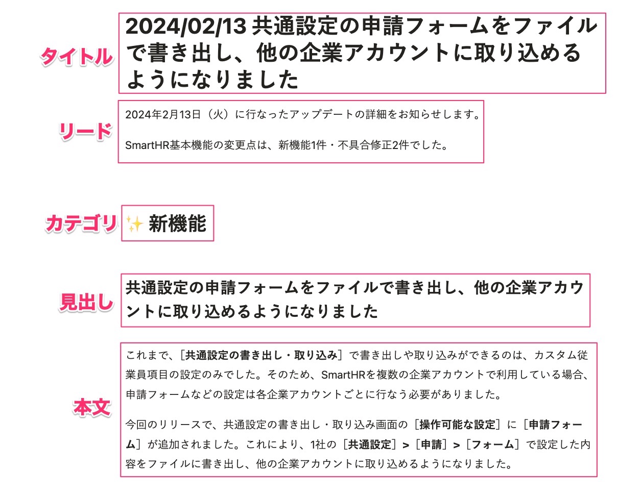 リリースノートを構成する要素別の書き方を説明します。